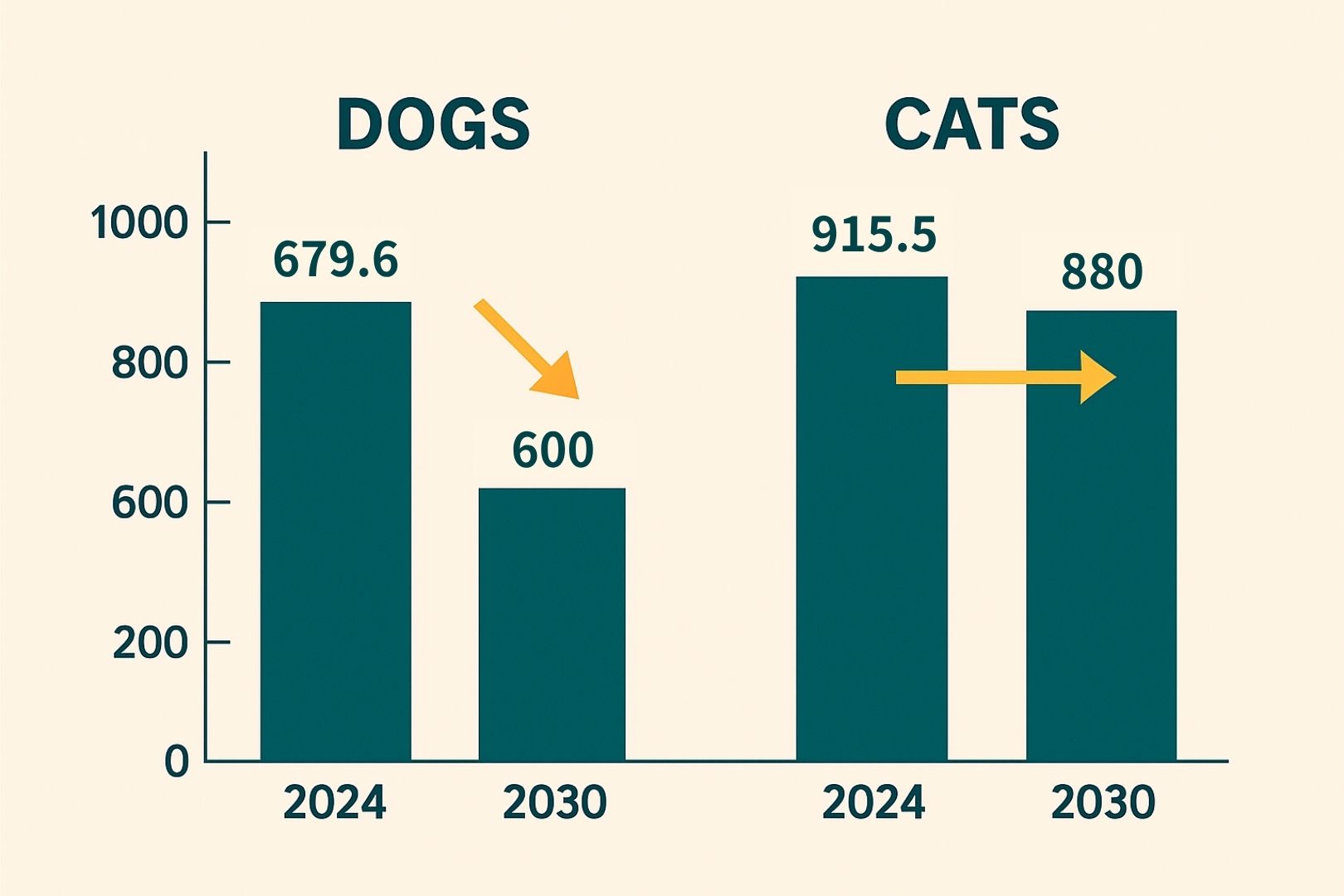 ペットフード協会が公表する過去11年の新規登録数を単純線形で外挿すると、犬は2030年に600万頭弱まで減少すると見込まれます。猫も過去の緩やかな増加が頭打ちになり、880万頭前後で縮小に転じるシナリオが想定されます。