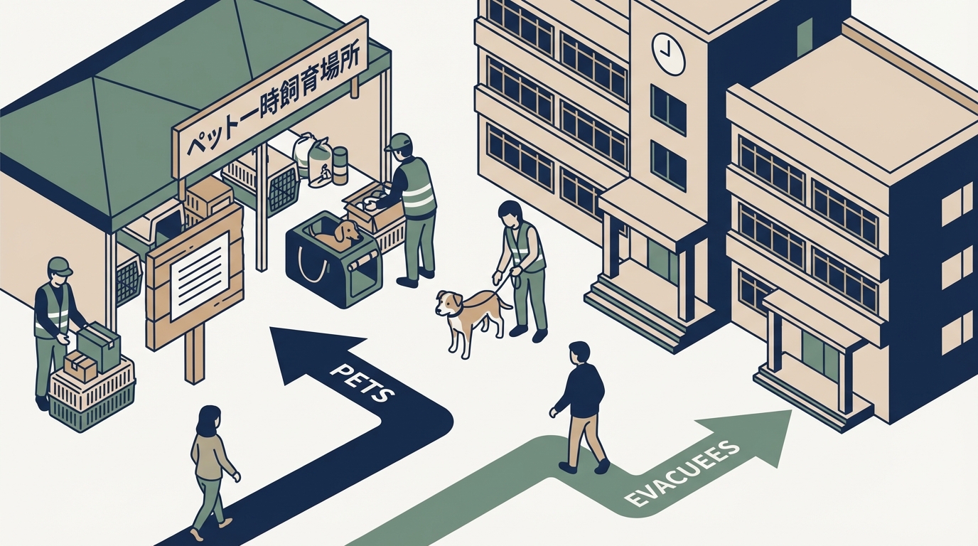 訓練で検証すべきポイントとして、避難経路上でのペット連れの動線(キャリーバッグやケージを持った状態での移動)、一時飼育場所の設営手順と所要時間、ペットの飼い主と一般避難者の動線の分離、飼い主同士の自主管理体制の構築があります。
